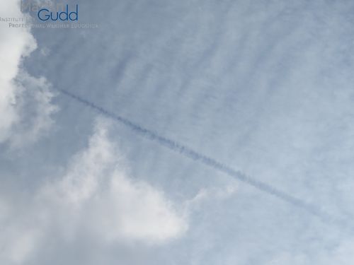 Die Spur des hochfliegenden Flugzeugs zeigt hier einerseits Wolkenauflösung, andererseits aber auch schmale, langgestreckte Wolkenneubildung – ein Zeichen dafür, dass in diesem seltenen Falle der Cirrocumulus zumindest teilweise aus stark unterkühlten Wassertröpfchen besteht.