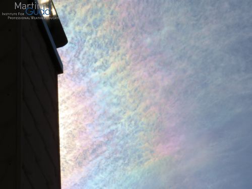 Die Unterscheidung zwischen Korona und Irisieren ist mitunter schwierig. Doch kann man bei einer irregulären Farbabfolge innerhalb der Erscheinung oder bei der Tatsache, dass entlang von Wolkenrändern die Farben besonders gut ausgeprägt sind, von Irisieren ausgehen. Das folgende Bild zeigt das Irisieren eines Altocumulus in der Nähe der Sonne.