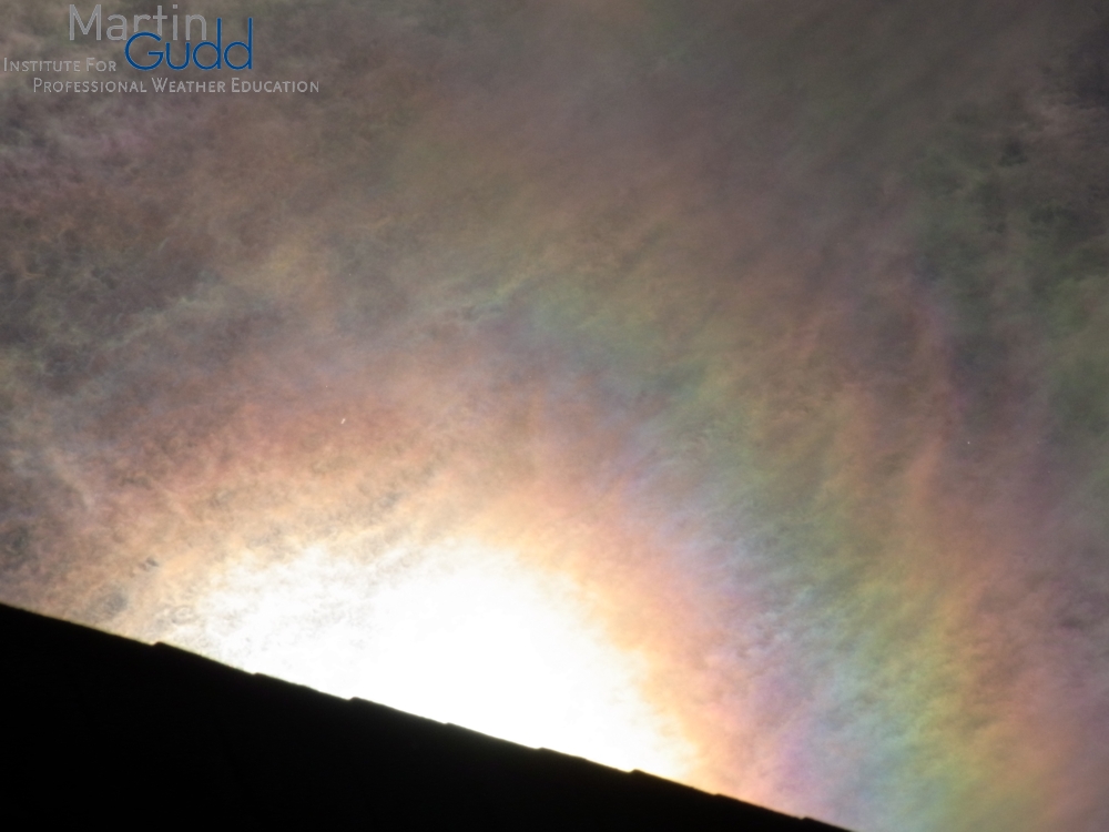 It is sometimes difficult to distinguish between corona and iridescence. However, iridescence can be assumed if there is an irregular colour sequence within the phenomenon or if the colours are particularly pronounced along the edges of clouds. The following image shows the iridescence of an altocumulus near the sun.
